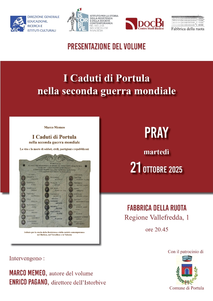 L’iniziativa è organizzata dall’Istituto per la storia della Resistenza e della societĂ contemporanea nel Biellese, nel Vercellese e in Valsesia, in collaborazione con il DocBi – Centro Studi Biellesi e con il patrocinio del Comune di Portula.